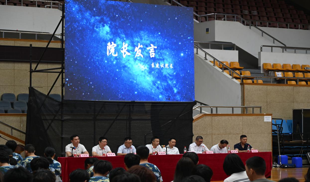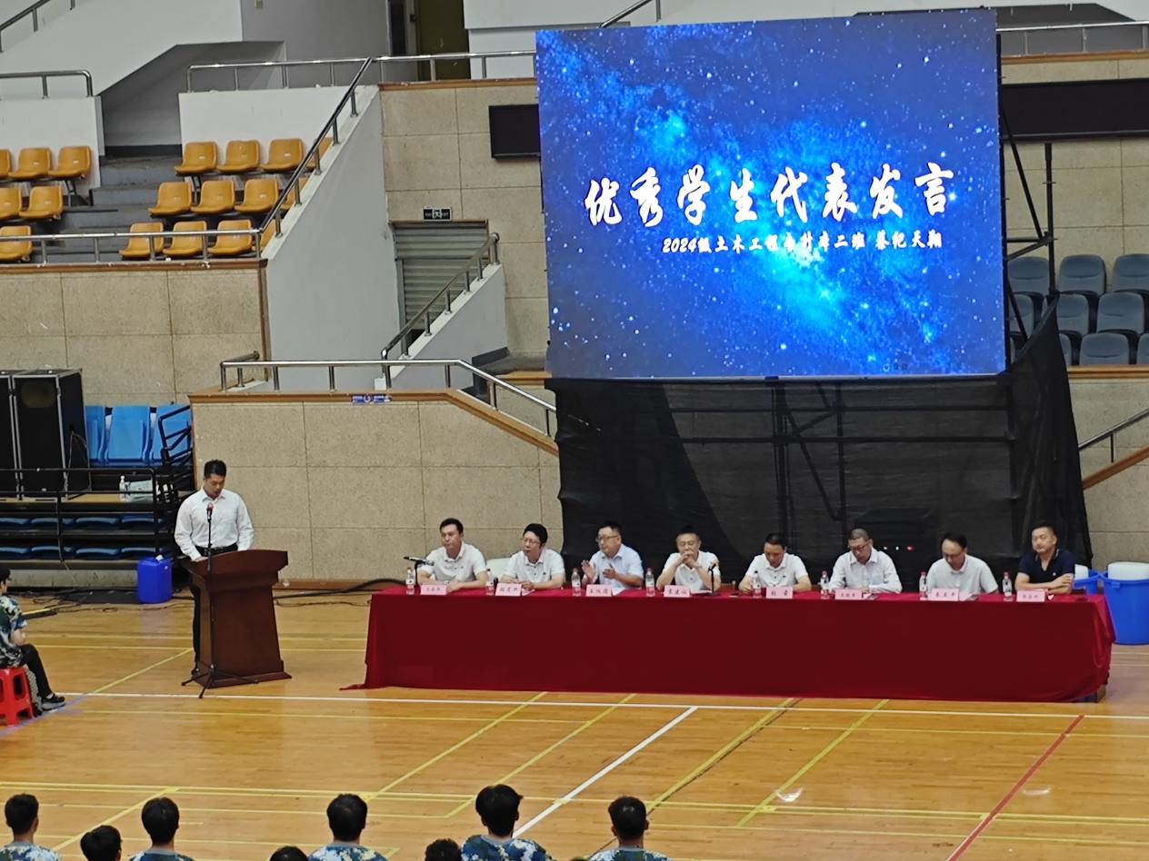 2025级工程管理一班蔡诗怡作为新生代表发言,她分享了初入校园的憧憬与期待,表示将以勤奋为笔、以梦想为墨,在大学舞台书写青春华章;2024级土木工程专升本二班蔡纪天翔作为优秀学生代表,结合自身成长经历,鼓励新生们积极探索、勇于挑战;2025级土木工程专升本二班张鹏远作为新生班主任,以师长的视角为新生们规划大学生涯提出了恳切建议。院长袁建议在发言中,对2025级新生的到来表示热烈欢迎,他从专业发展、个人成长等维度,寄语新生们要锚定目标、深耕学业、全面发展。黄石市市政建设集团有限公司总经理王仪德也登台致辞,他结合行业发展前景,鼓励土木学子们夯实专业基础,未来积极投身市政建设领域,实现个人价值与社会价值的统一。